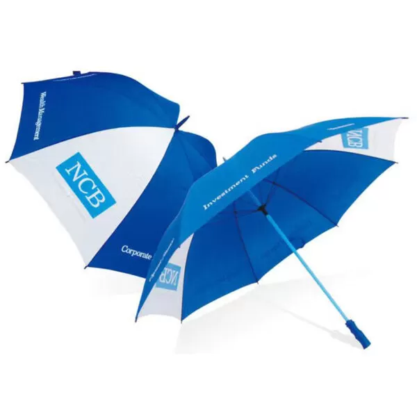 Upgrade your promotional branding with this high-quality color matching golf umbrella! Featuring a blue & white canopy, durable 190T polyester fabric, and a windproof frame, this umbrella is perfect for NCB Clubs, corporate promotions, and sports events. Customize with your brand colors and logo for a professional and stylish look.