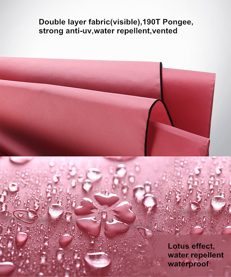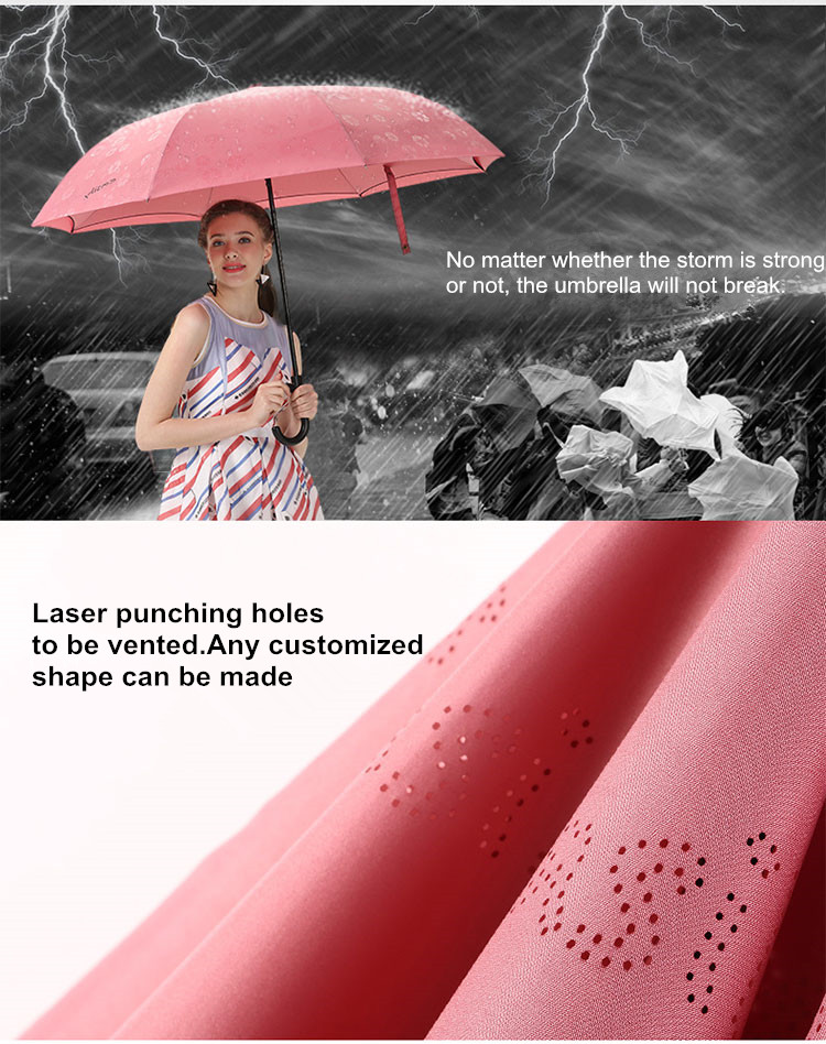 -Double layer of frame(16 fiberglass ribs),vent/inverted -Anti-thunder,flexible fiberglass long ribs -Windproof(reverse style) |